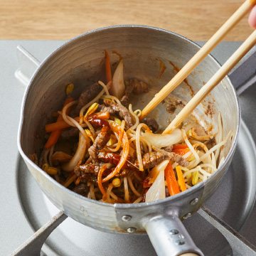焼肉用のうまみの濃い肉と野菜を、香りのよいごま油で炒めるのがおいしさのポイント。さらに、にんにく、コチュジャンなどで香りをプラス。